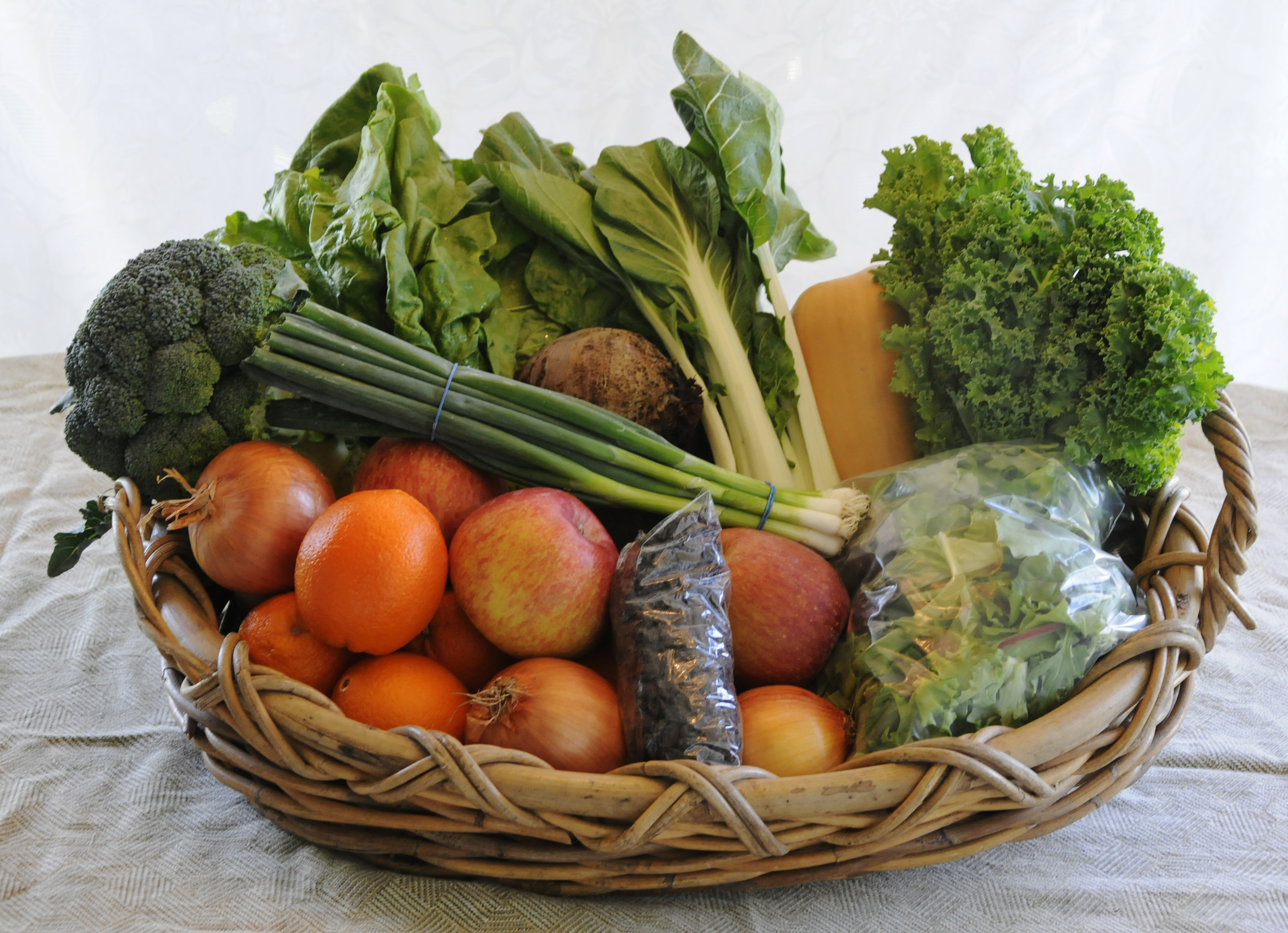 Spinach, broccoli, bok choy, kale, onions, salad mix, winter squash, beets, green onions, apples, raisins, oranges