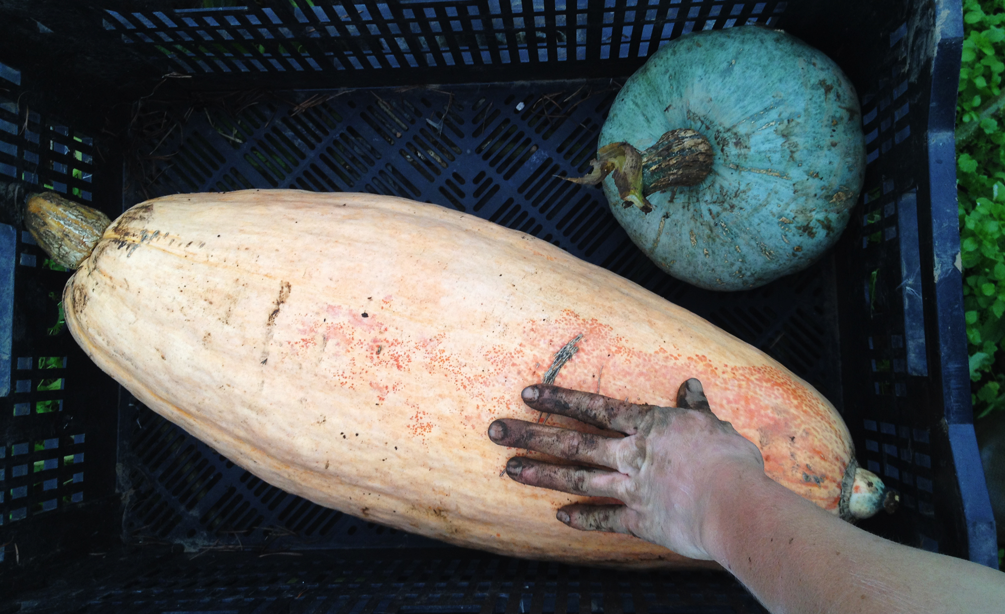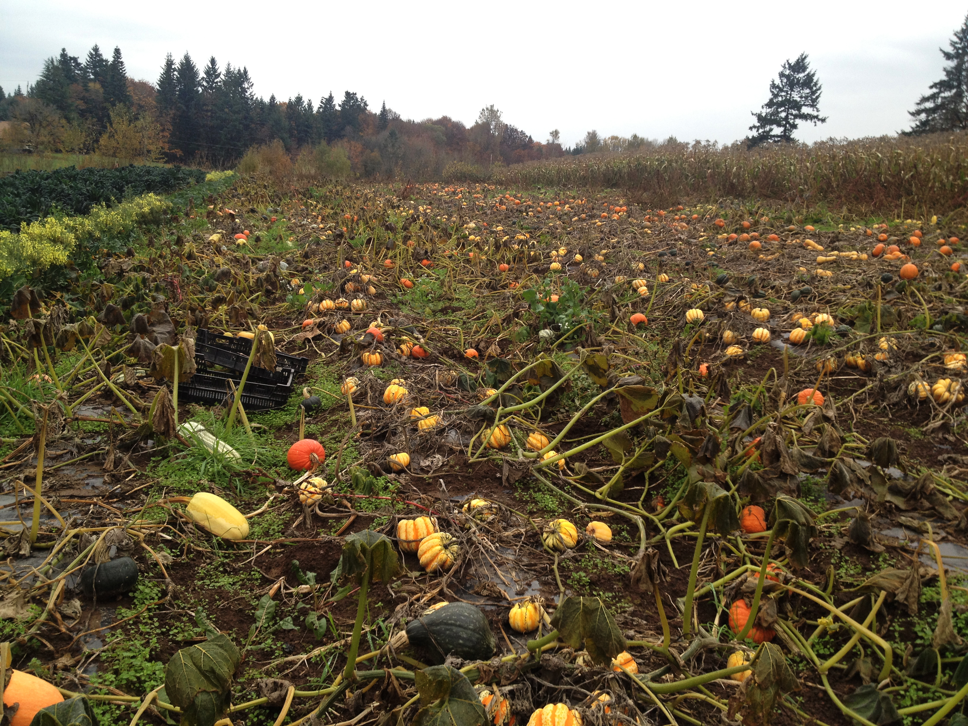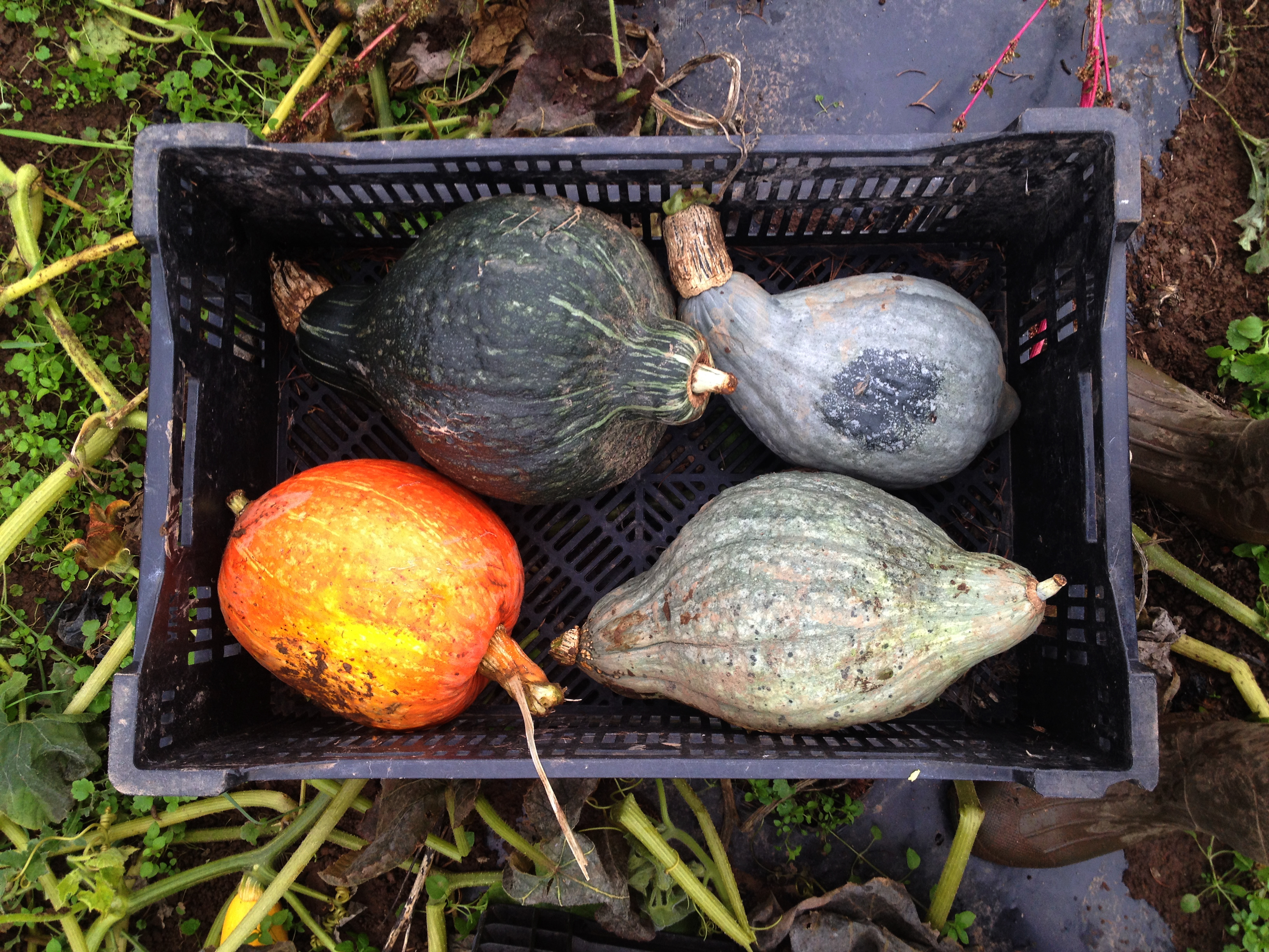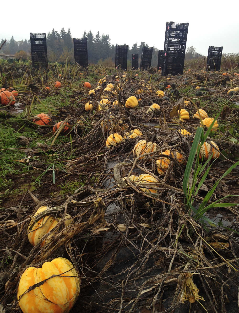 Meanwhile, we’d like to show some photos (taken today) of the beginning of our winter squash harvest. It’s getting cold, and these beauties need to come off the field before the frost gets them. Fall crops are heavy work, but so rewarding. The colors, shapes and textures dotting the field right now are incredibly pleasing to the eyes, and it’s a proud and awe-filled time as we gather up the crop that we’ve watched grow for months.